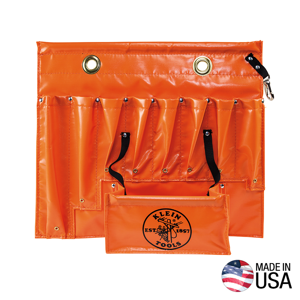 - 8 hand-tool pockets, one pouch and a swivel snap hook